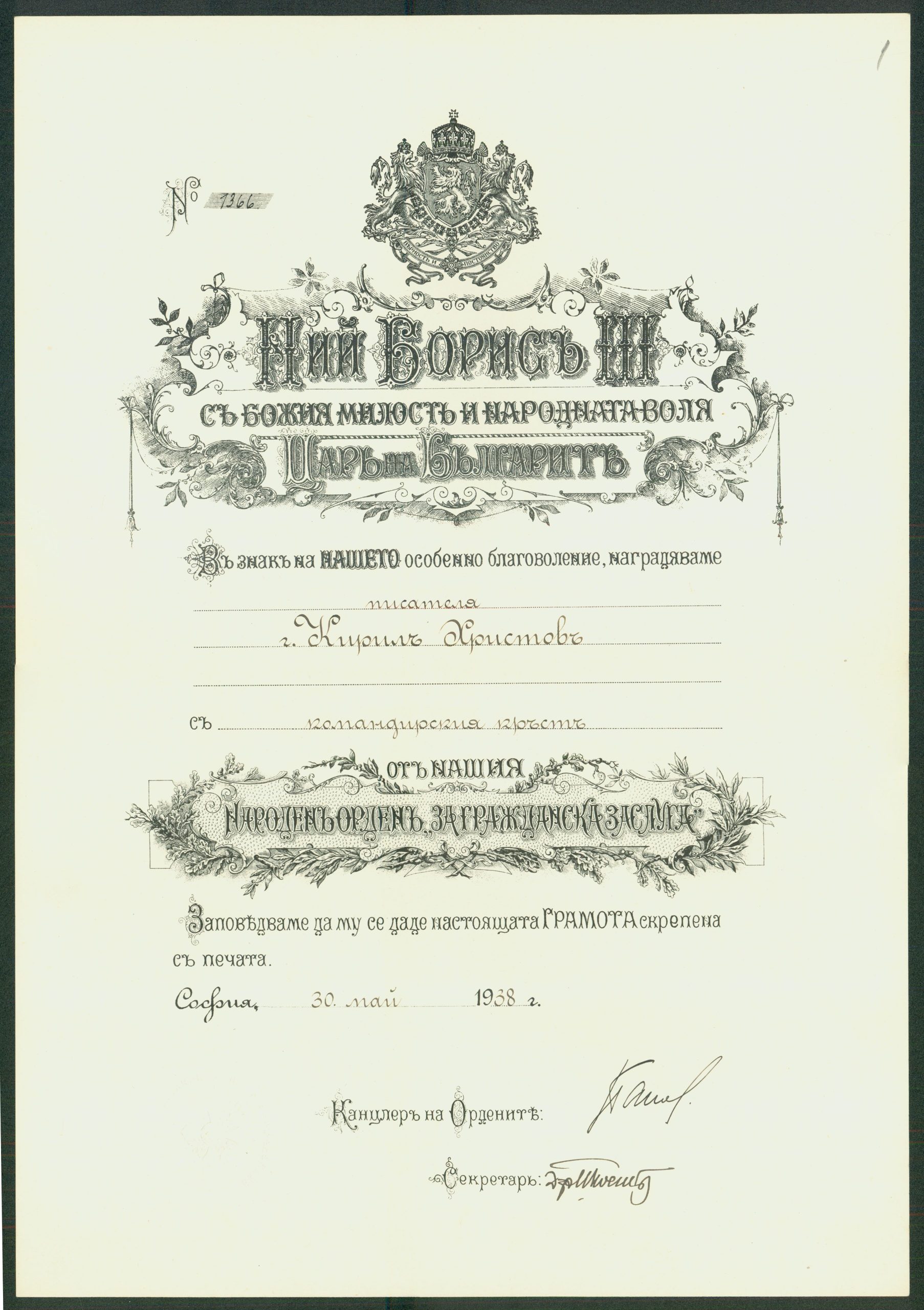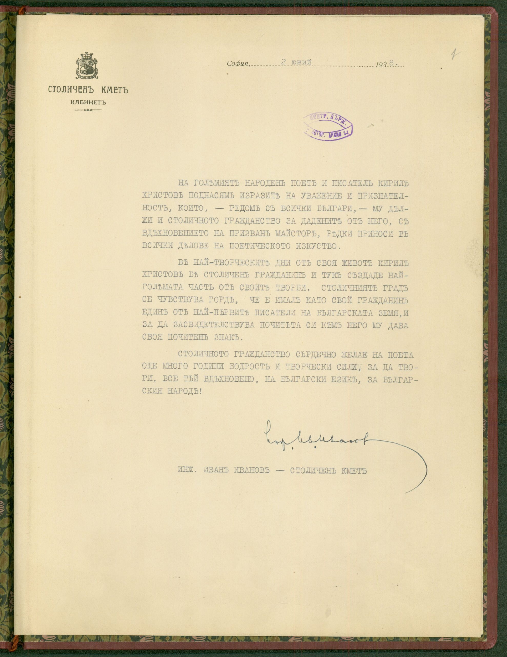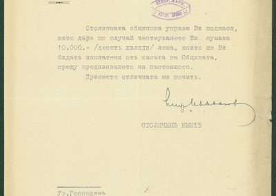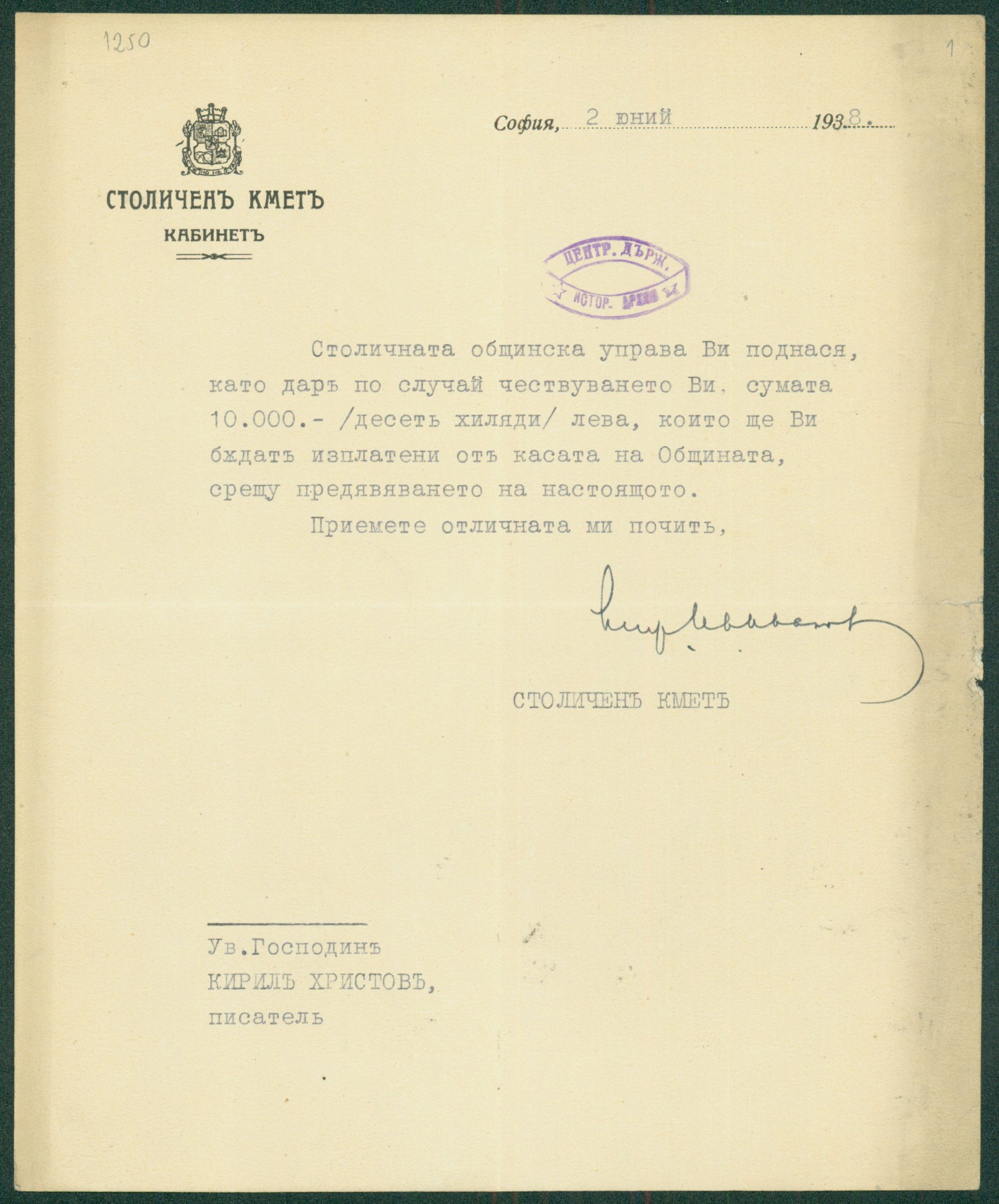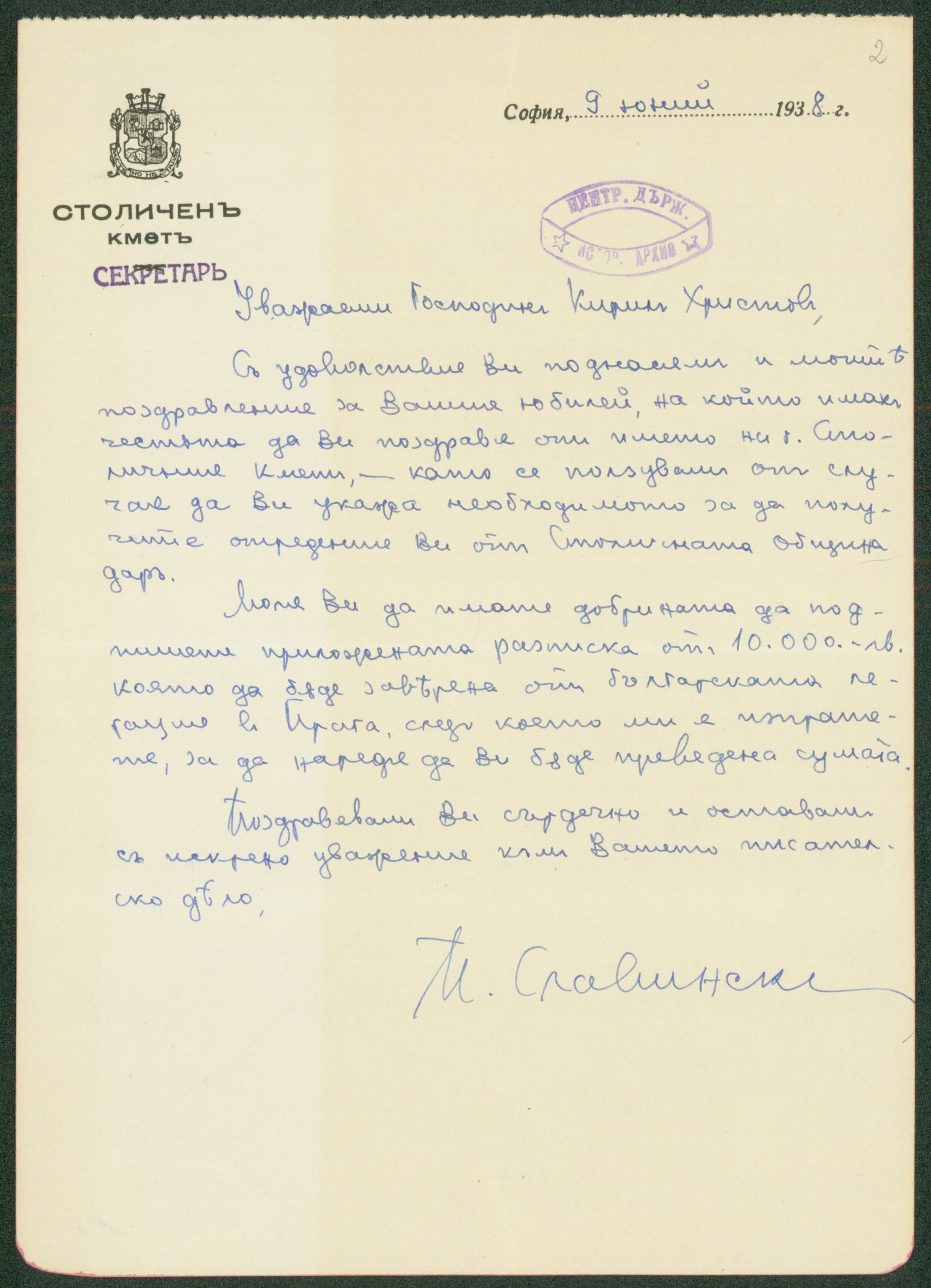Писма от столичния кмет инж. Иван Иванов и главния секретар на общината във връзка с отпускане на 10000 в. като дар, по случай юбилея на К. Христов 02 – 09.06.1938 г.