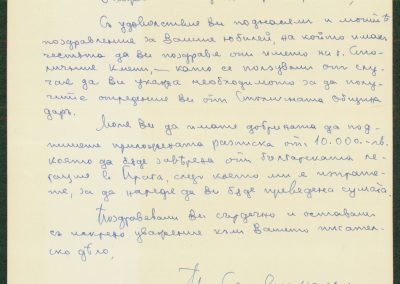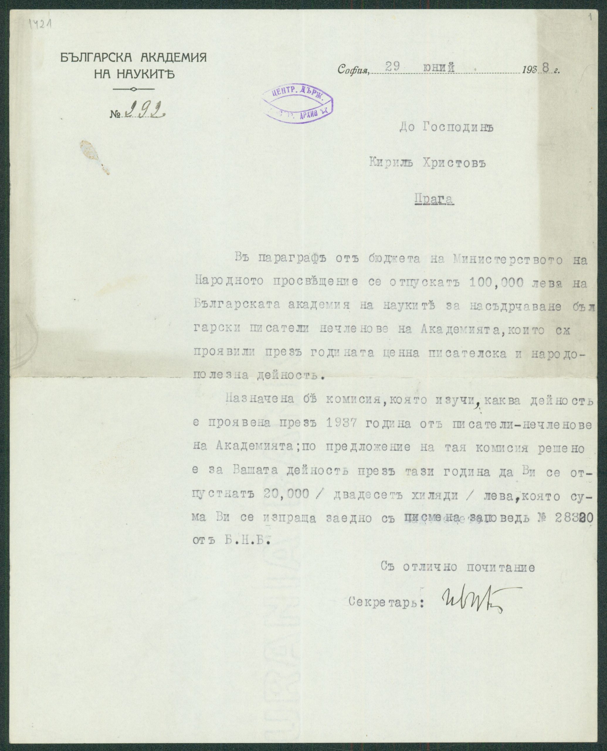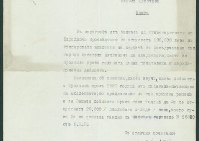 Писмо от БАН до К. Христов, с приложение писмена заповед за отпускане на сумата от 20000 лв. за насърчение на български писатели, нечленове на академията.