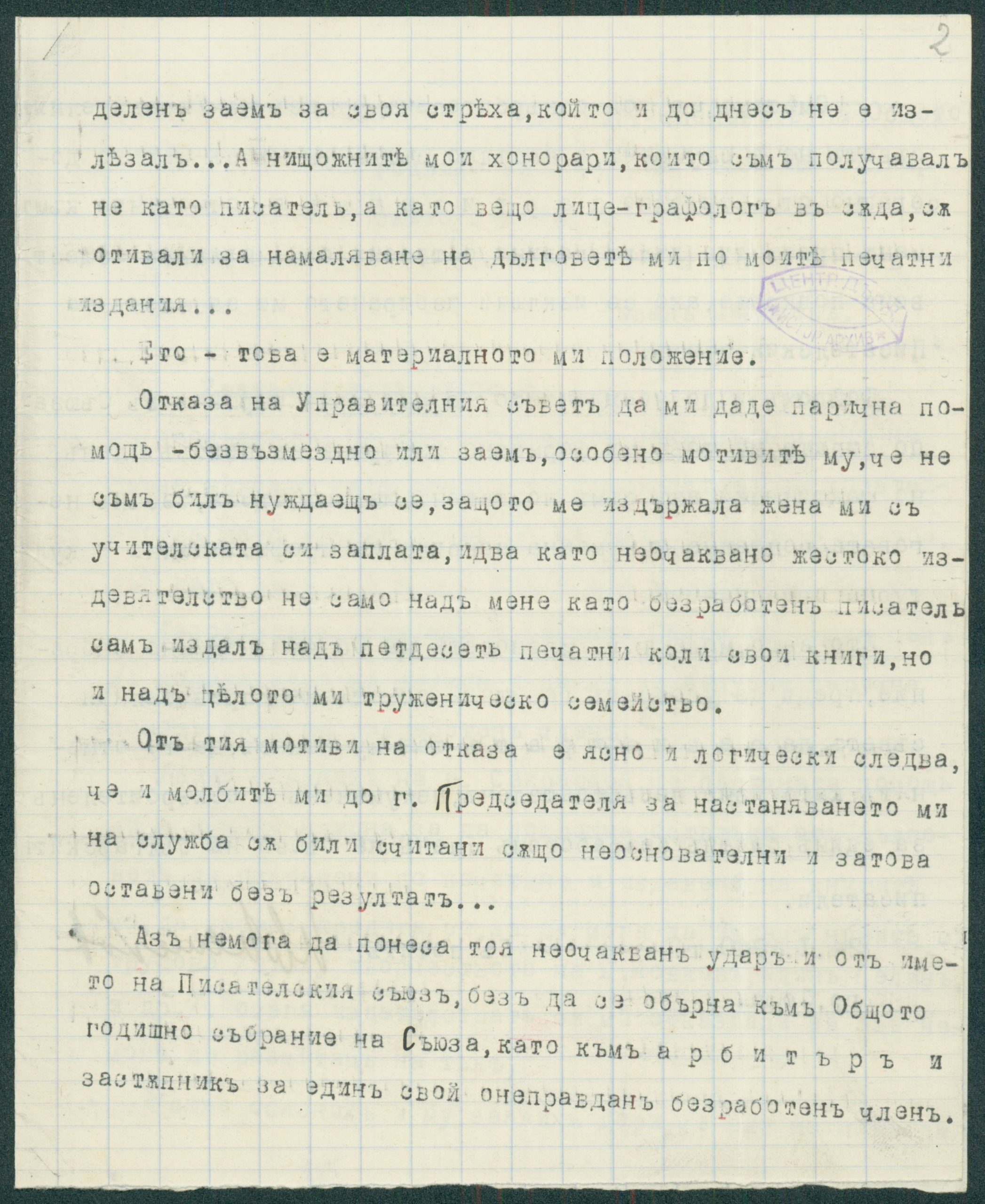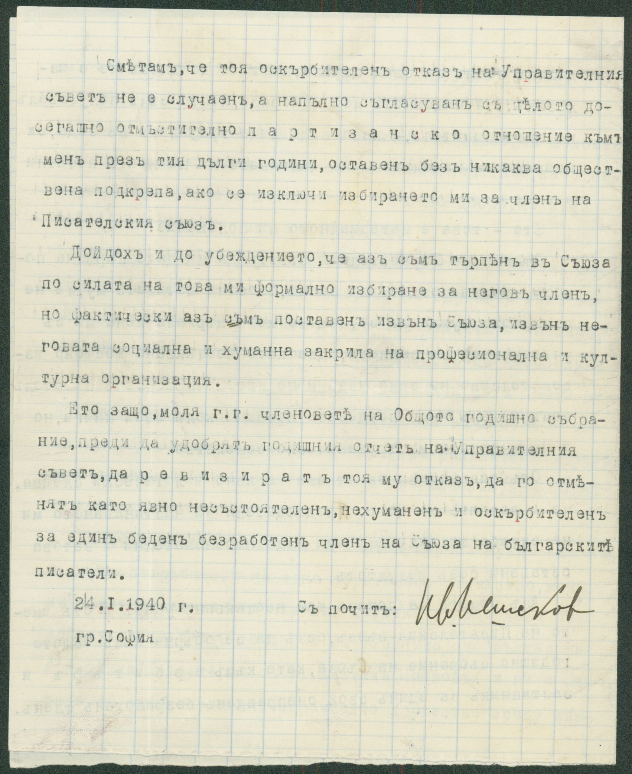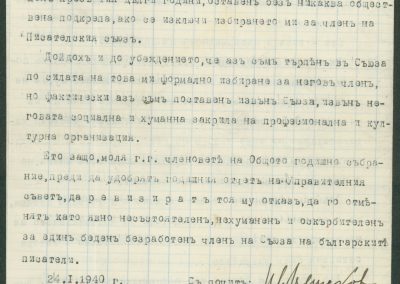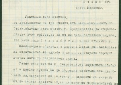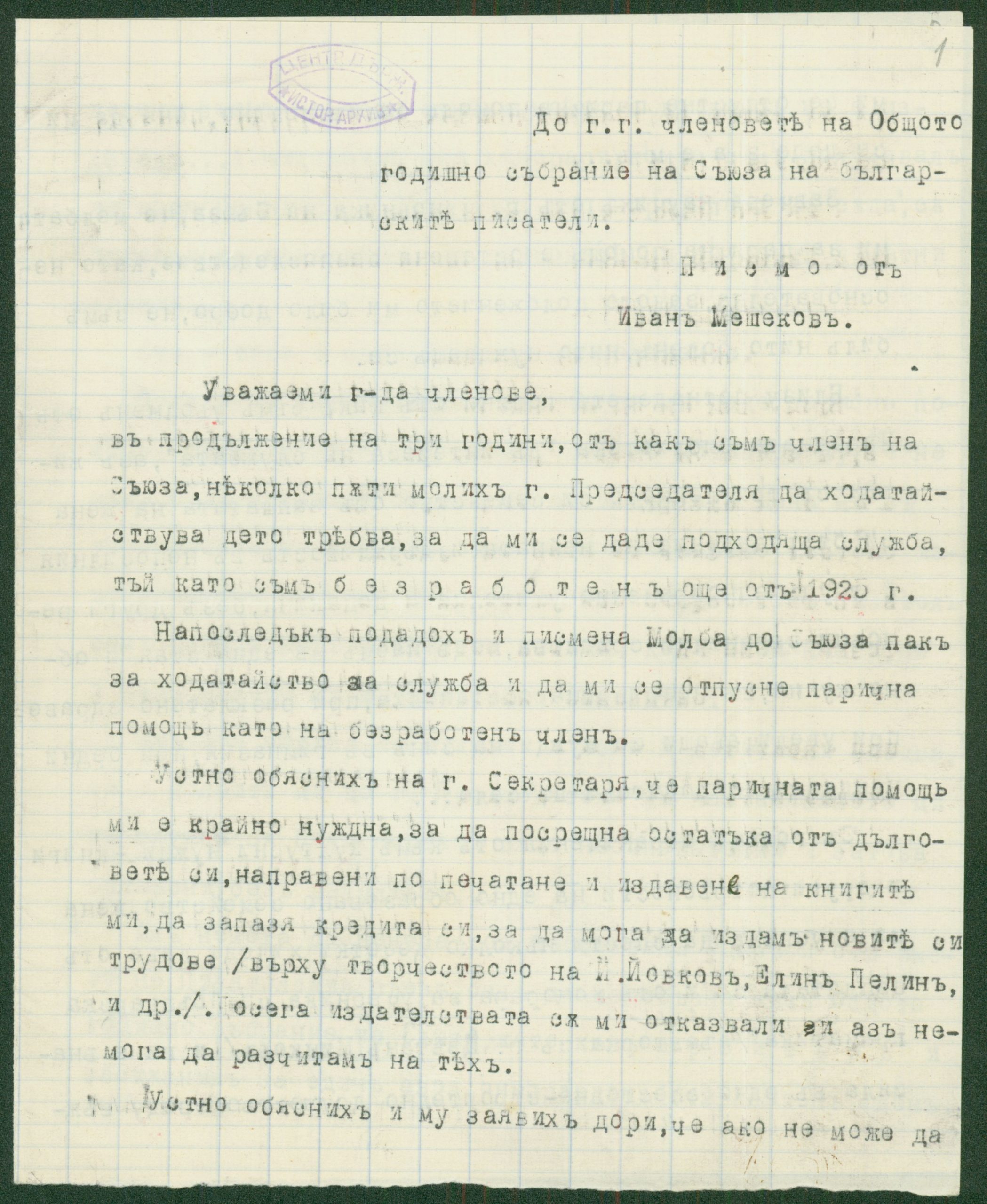 Писмо от Иван Мешеков, София, до членовете на Общото годишно събрание на Съюза на българските писатели относно назначаването на К. Христов на служба и отпускането на парична помощ като безработен член – 1940 г.