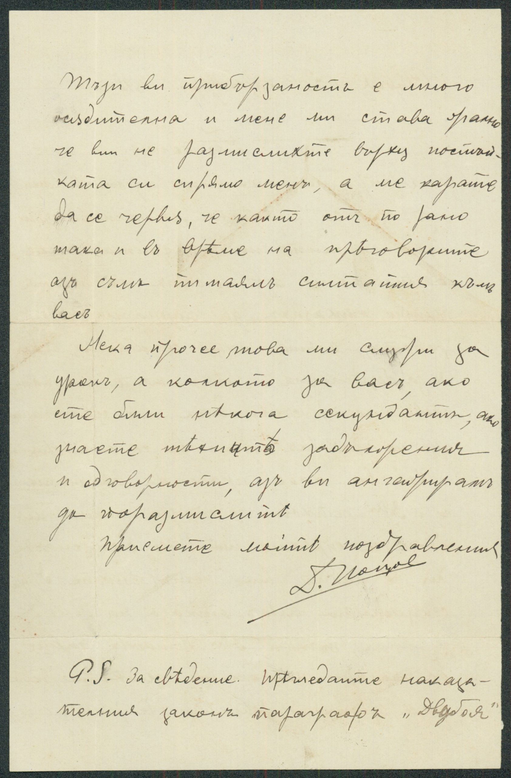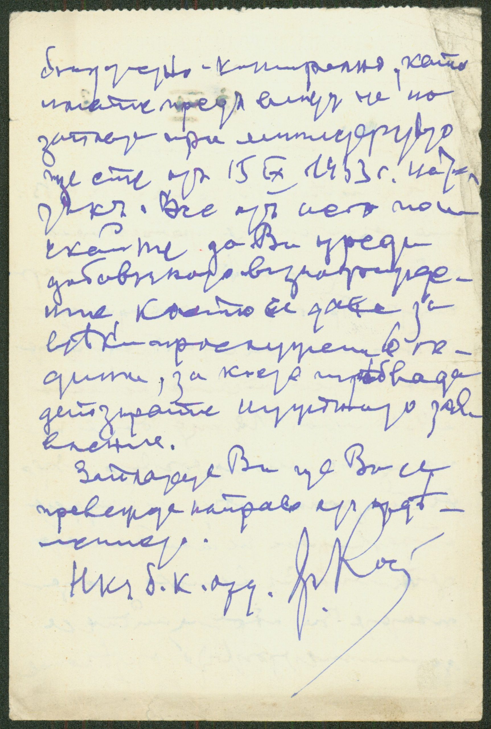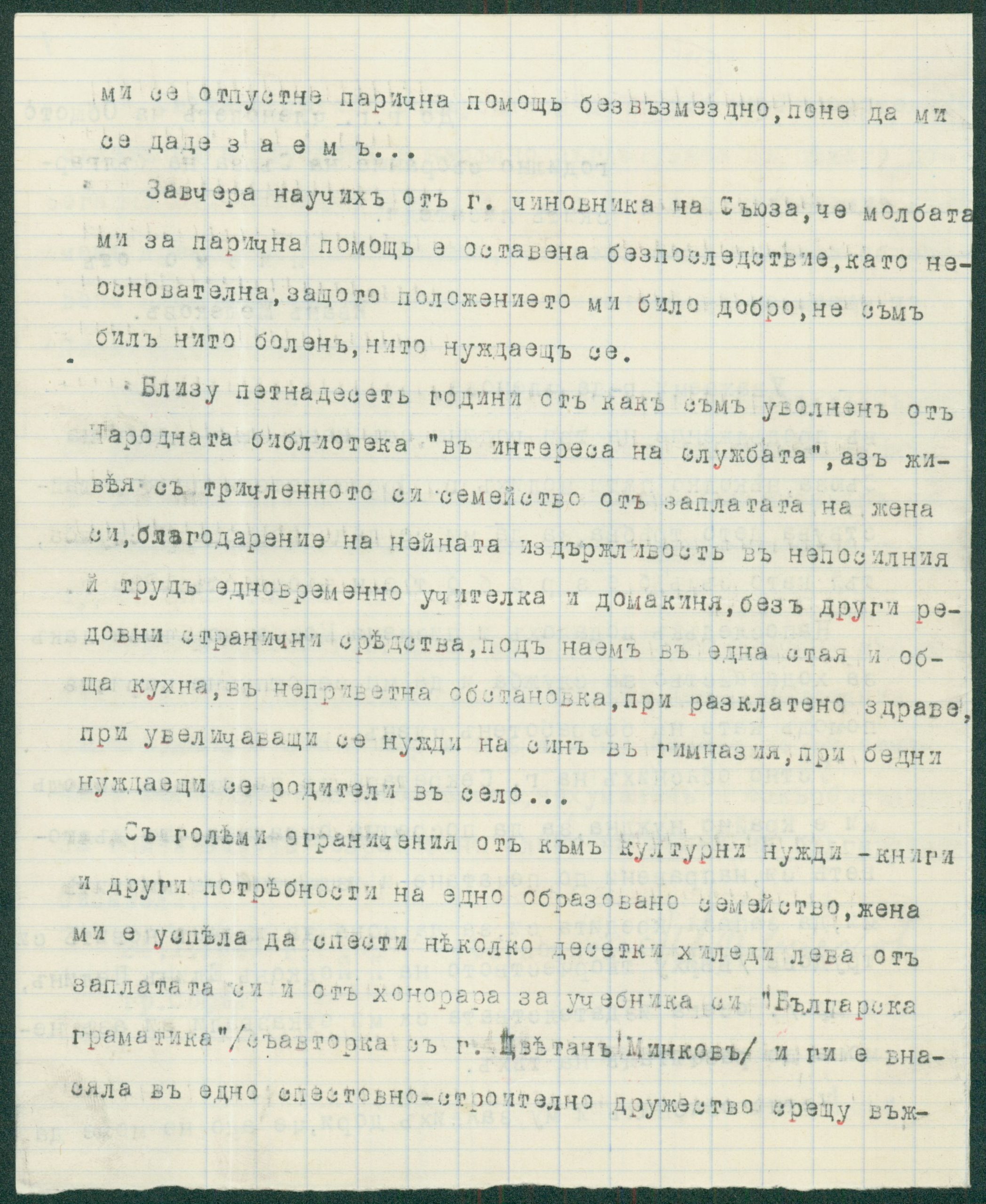 Писмо от Иван Мешеков, София, до членовете на Общото годишно събрание на Съюза на българските писатели относно назначаването на К. Христов на служба и отпускането на парична помощ като безработен член – 1940 г.