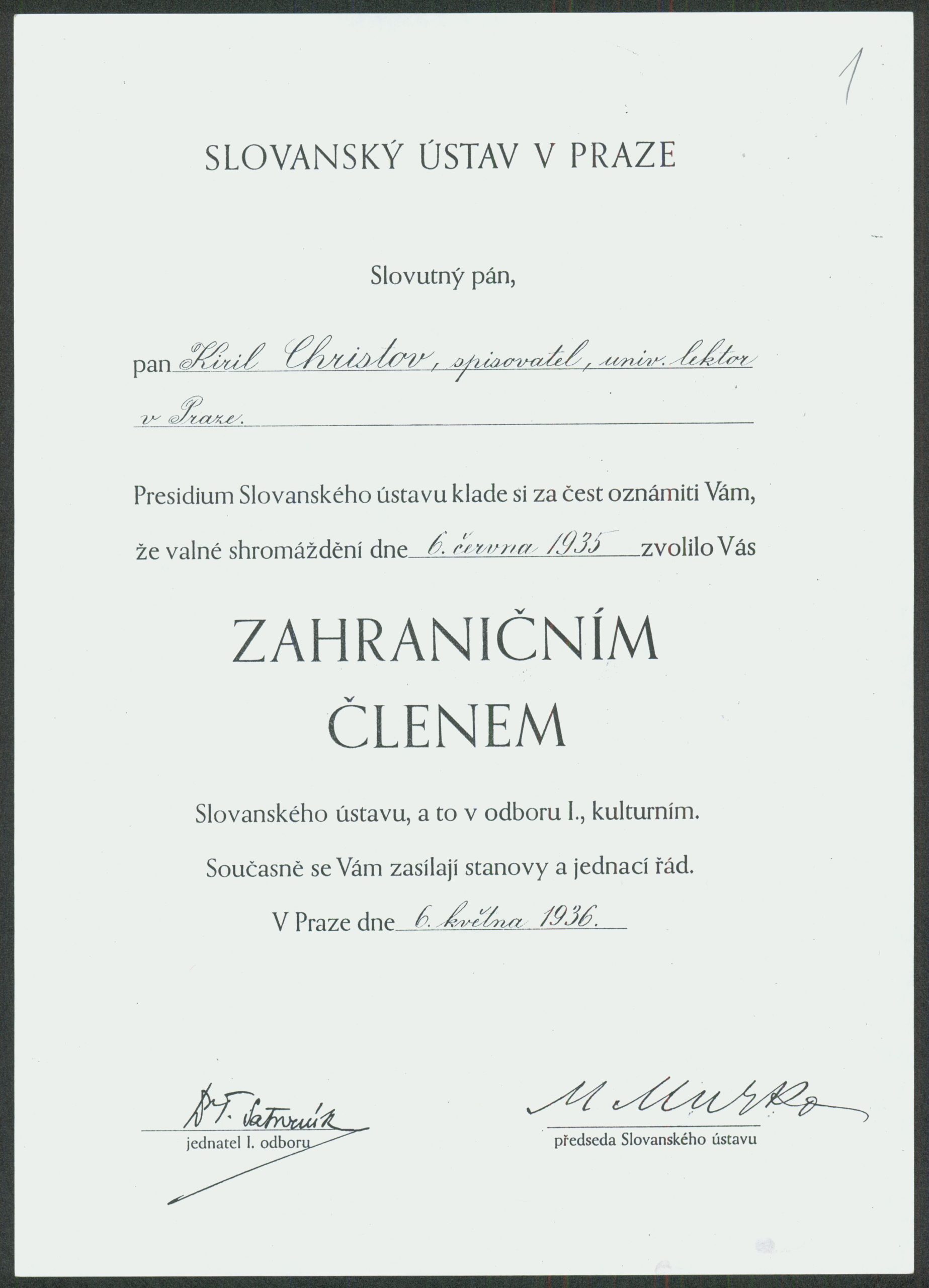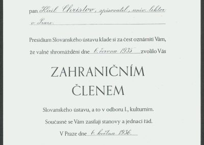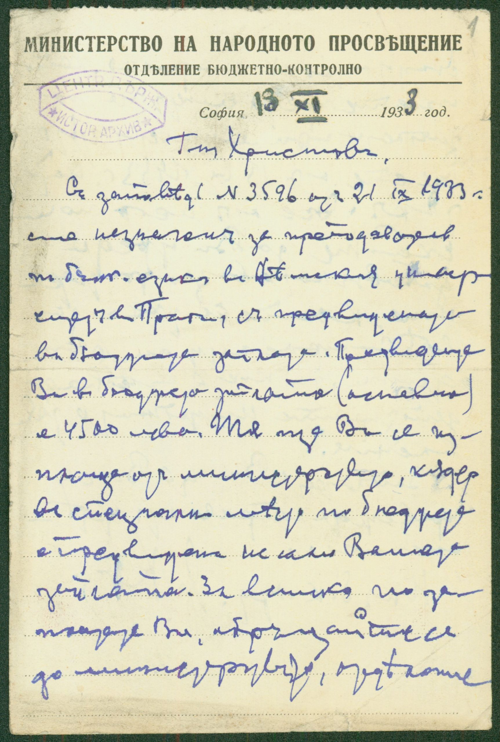 Писмо от Хр. Костов, началник на библиотечно-културния отдел при Министерство на народната просвета, относно назначаването на К. Христов преподавател по български език в Немския университет в Прага – 1933 г.