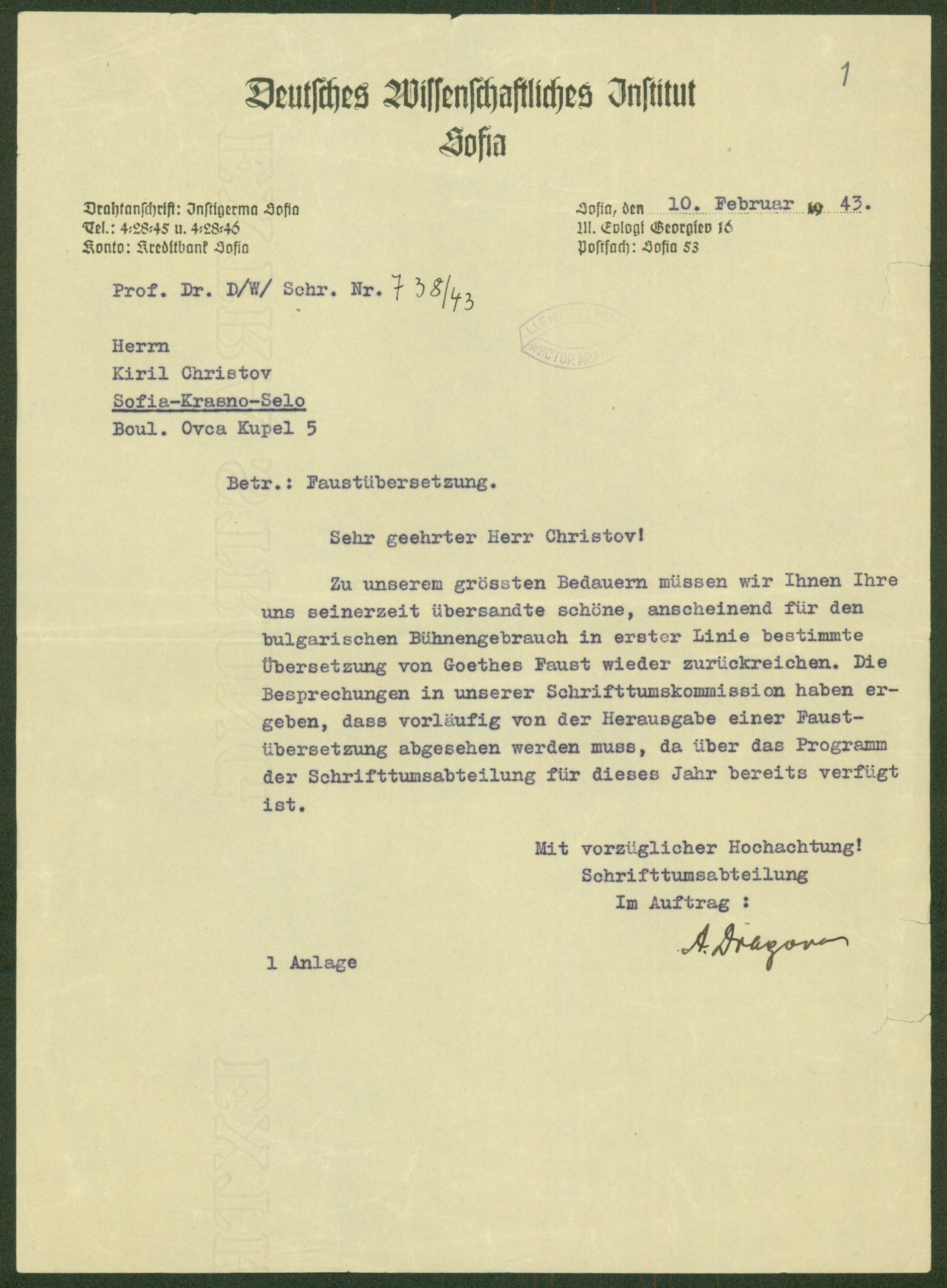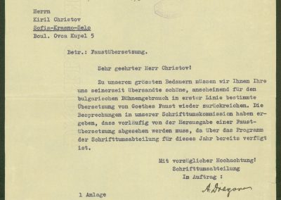 „Фауст“ от Гьоте в превод на К. Христов, приложен към писмо от Германския научен институт в София с мнение за превода на книгата. Нем. ез. – 1943 г.