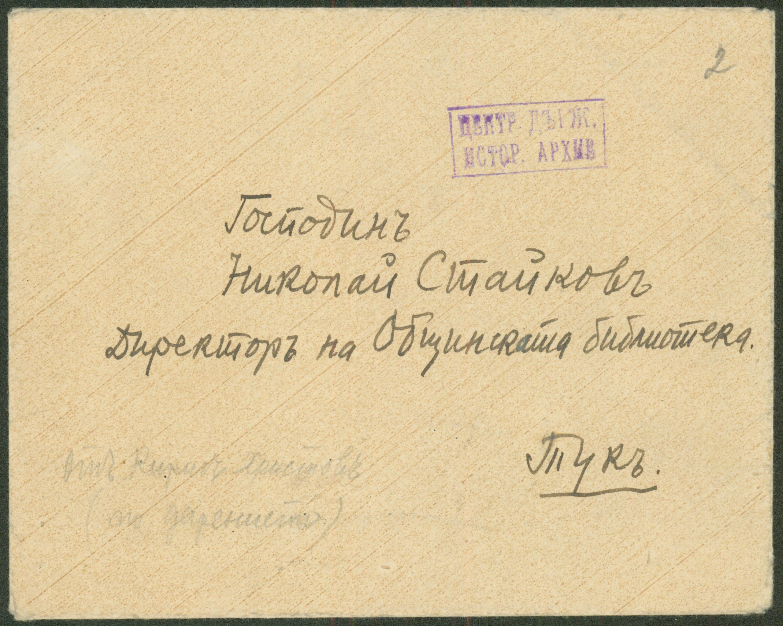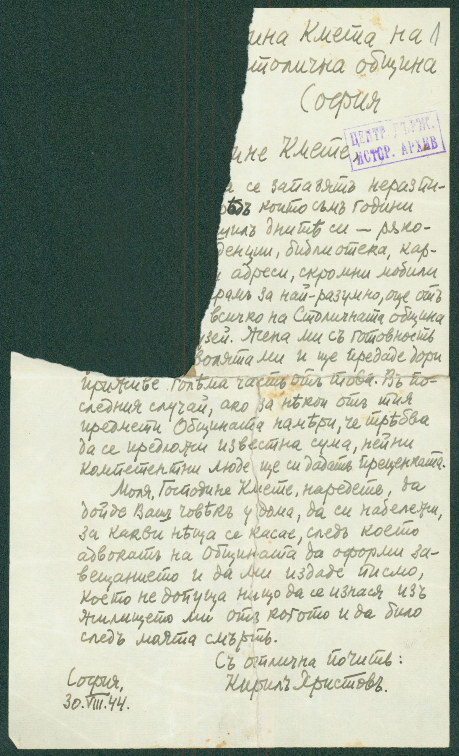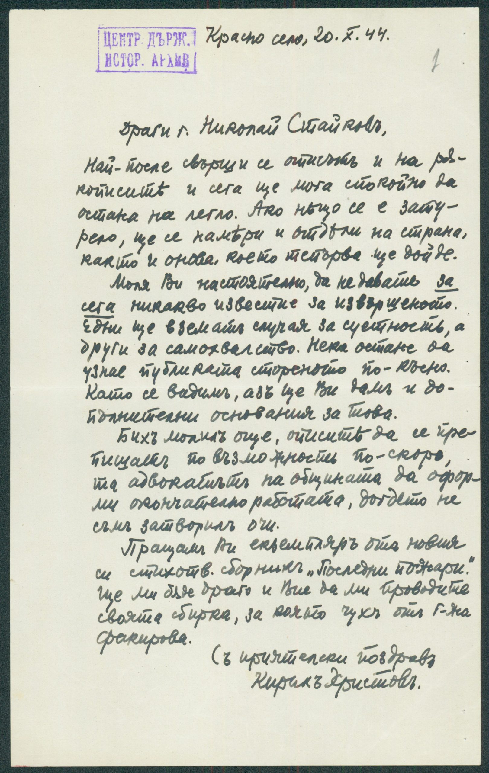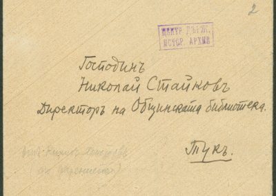 Писмо от К. Христов до Николай Стойков – директор на Общинската библиотека относно своето дарение – 20.10.1944 г.