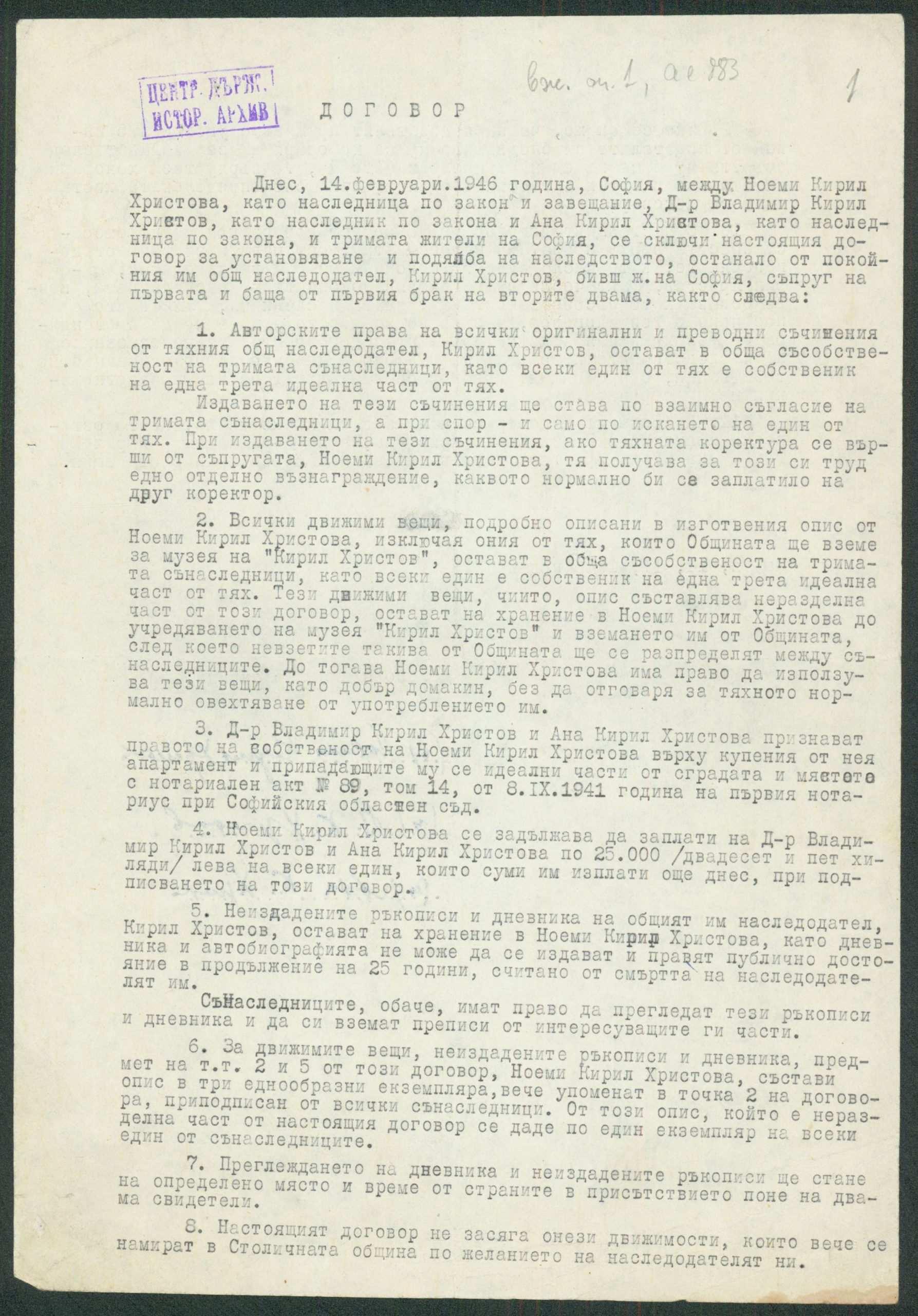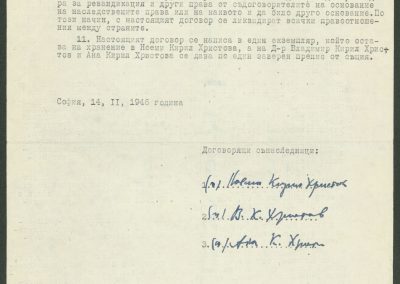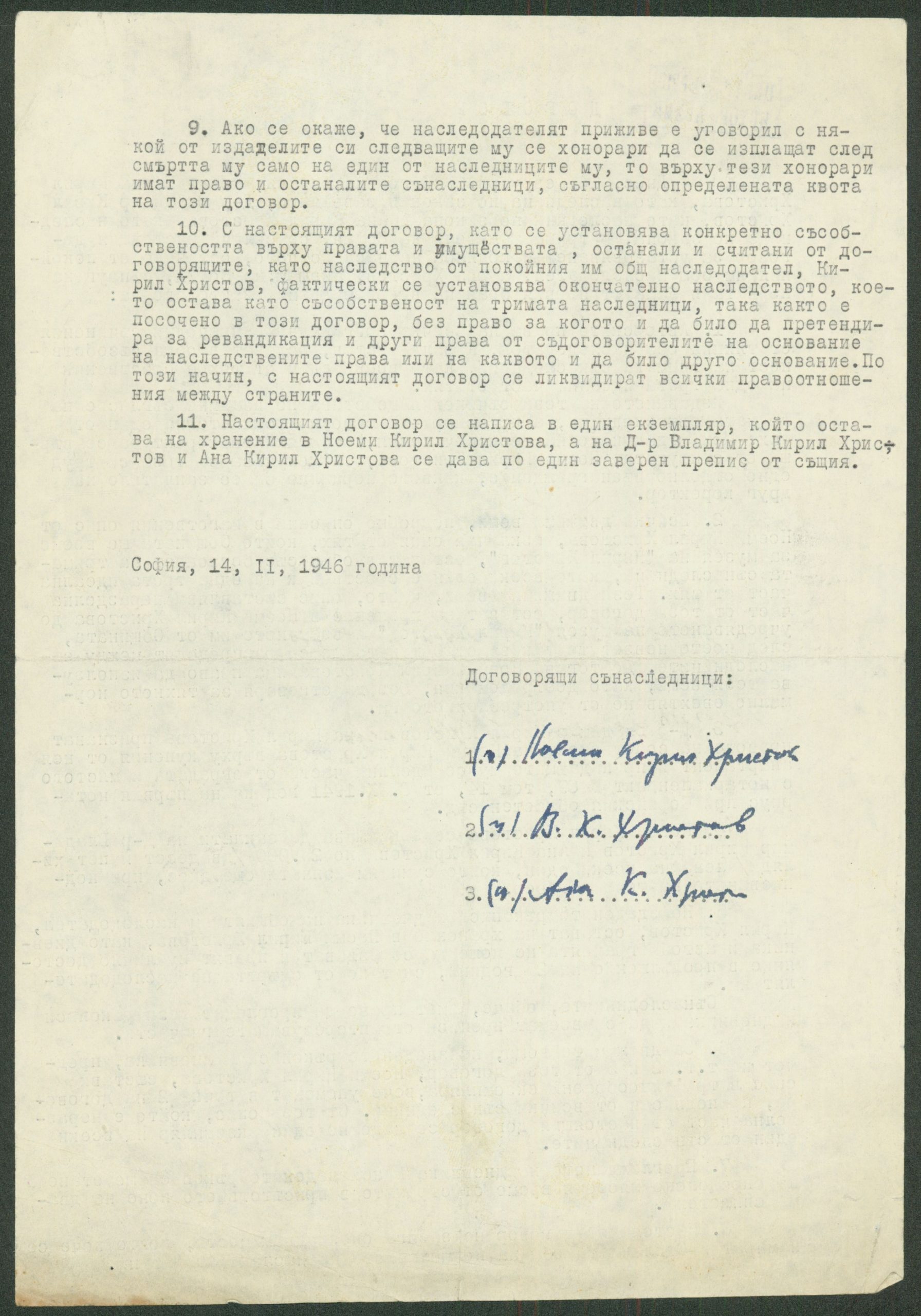 Договор между Ноеми Кирил Христова, д-р Владимир Христов и Ана Христова за установяване и подялба на наследството на К. Христов – 14.02.1946 г.